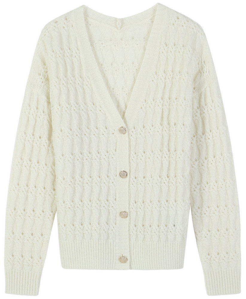 21005 7GG 2/28 90%WOOL 10%CASHMRER LADIES' KNITTED V NECK LONG SLEEVE CABLE POINTELLE CARDIGAN WITH LUREX AND BUTTONS