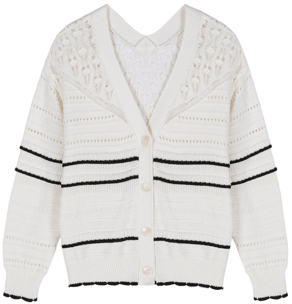 21007 7GG 2/21 100%COTTON LADIES' KNITTED DOUBLE V NECK LONG SLEEVE DROP STITCH AND POINTELLE JACQUARD CARDIGAN WITH ZIGZAG STRIPES
