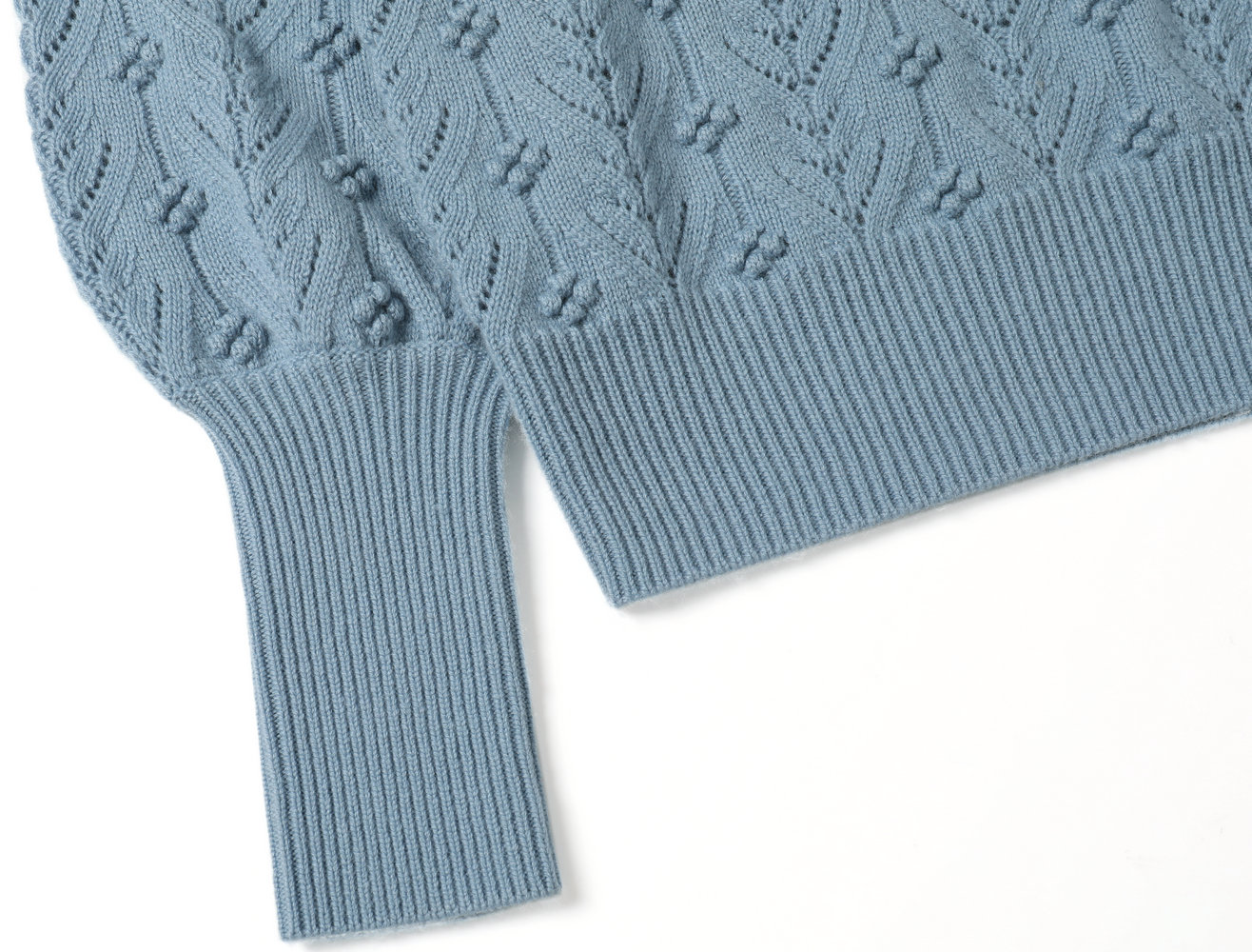 21038 7GG 2/28 90%WOOL 10%CASHMRER LADIES KNITTED ROUND NECK BIG FRENCH SLEEVE POINTELLE PULLOVER WITH SELFYARN BALLS