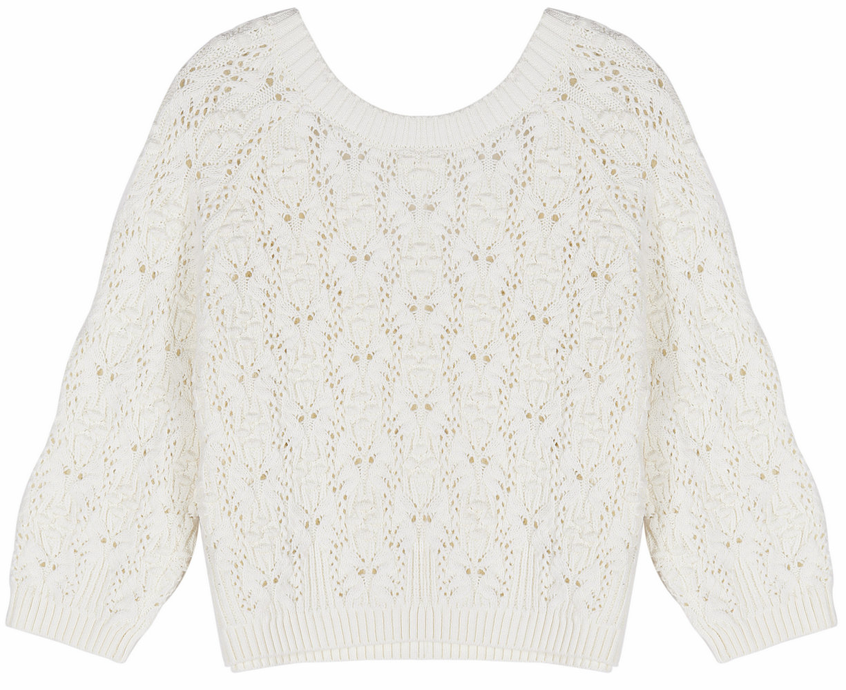 21042-1 7GG 2/16 60%COTTON 40%ACRYLIC LADIES' KNITTED ROUND NECK 3/4 SLEEVE POINTELLE JACQUARD PULLOVER WITH V NECK AT BACK