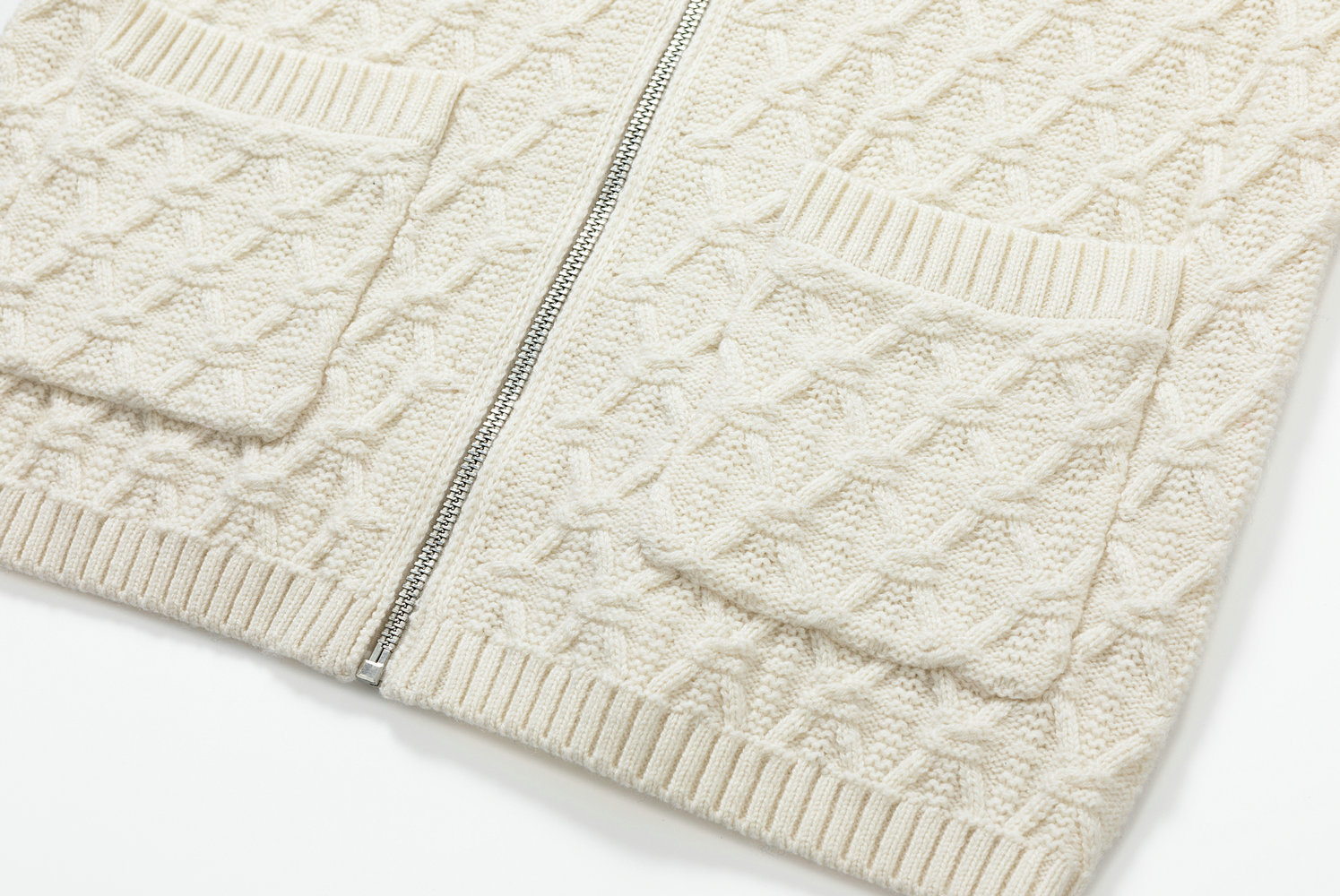 You are here : Home > Products > 21129 WOMEN’S KNITTED CARDIGAN ROUND NECK LONG SLEEVE DIAMOND JACQUARD WITH ZIPPER AND POCKETS MOQ 200PCS/COLOR