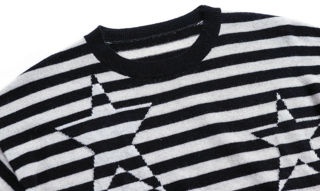 2139-1 12GG 2/26 100%CASHMERE LADIES' KNITTED ROUND NECK LONG SLEEVE CONTRAST COLOR STAR INTARSIA STRIPES PULLOVER