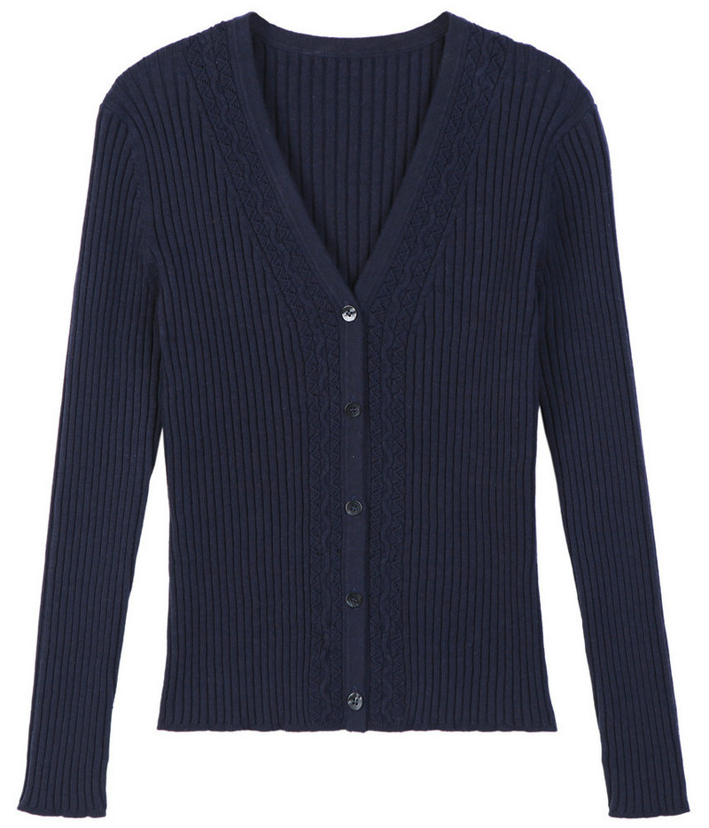 2207-1 12GG 2/48 70%COTTON 30%WOOL LADIES' KNITTED V NECK LONG SLEEVE RIB CARDIGAN WITH CABLE PLACKET