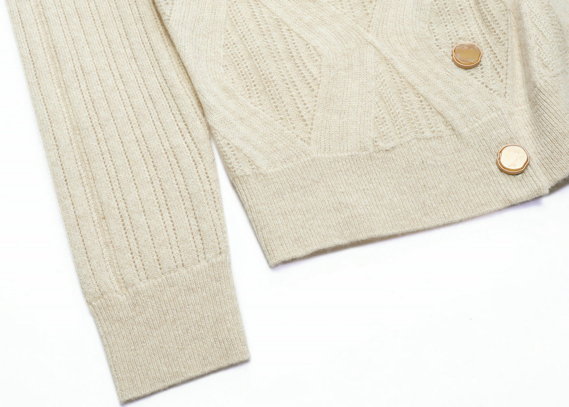 2237-2 12GG 2/26 100%CASHMERE LADIES' KNITTED ROUND NECK RAGLAN SLEEVE BI-COLOR POINTELLE CARDIGAN WITH BUTTONS AND LACE