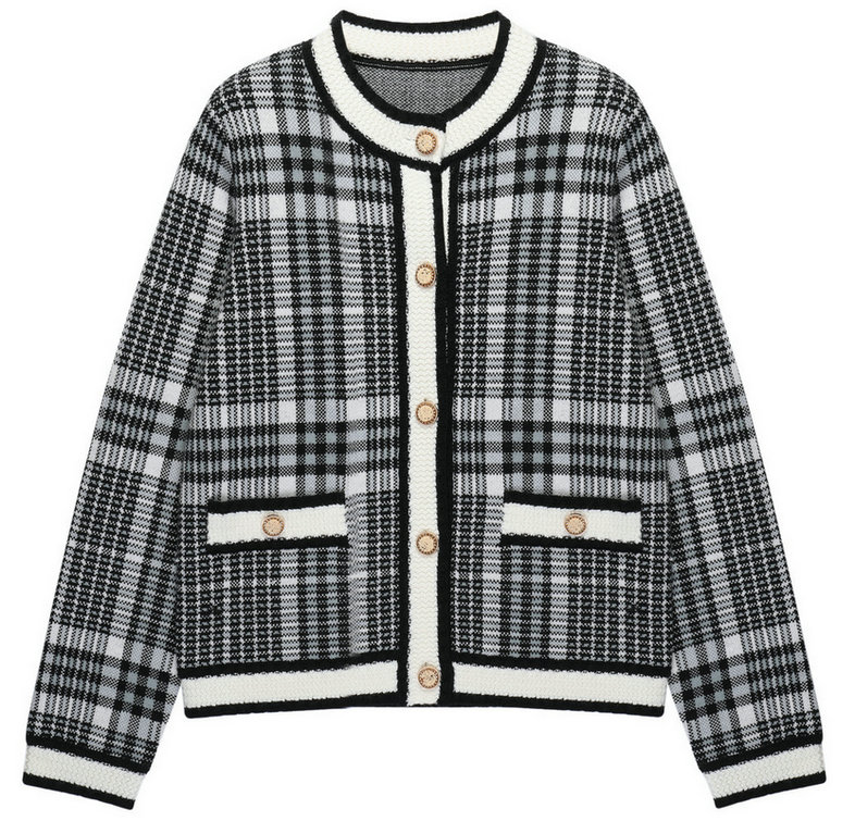 2246-1 12GG 2/48 100%WOOL LADIES' KNITTED ROUND NECK LONG SLEEVE SQUARE JACQUARD CARDIGAN WITH POCKETS BUTTONS AND CONTRAST COLOR EDGE
