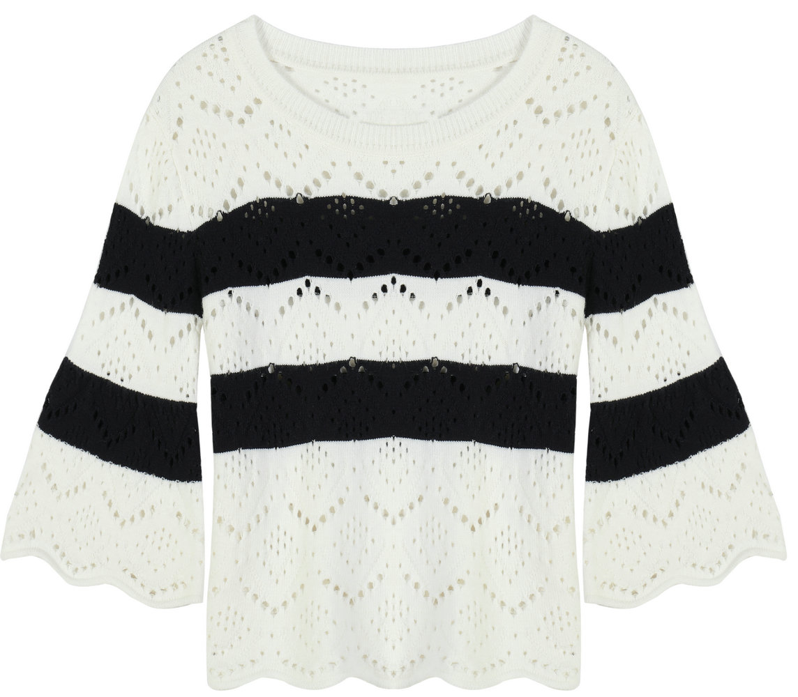 2382-1 7GG 2/48 42%VISCOSE 25%PBT 15%ACRYLIC 15%TENCEL 3%CASHMERE LADIES' KNITTED ROUND NECK 3/4 FLARE SLEEVE WIDE CONTRAST COLOR STRIPE POINTELLE PULLOVER WITH ZIGZAG EDGES