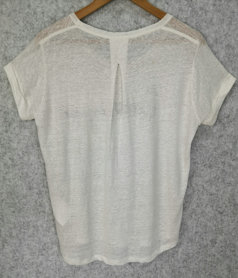 750036 30S 100%LINEN 200GSM LADIES' JERSEY ROUND NECK SHORT SLEEVE LETTER PRINTING PULLOVER WITH ONE CHEST POCKET AND PLEAT AT BACK NECK