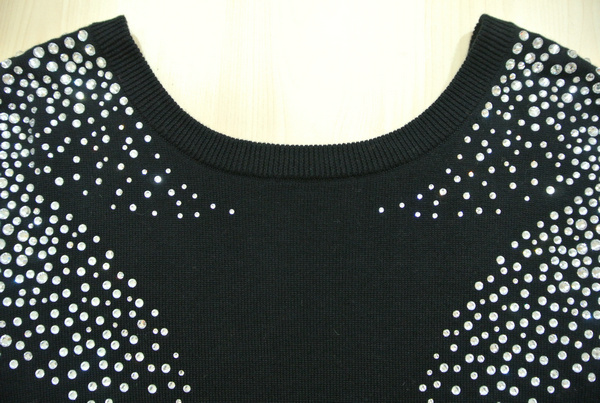 FLORE 12GG 2/48 70%COTTON 25%SILK 5%CASHMERE LADIES' KNITTED ROUND NECK LONG SLEEVE HOT FIX PULLOVER WITH BACK V NECK