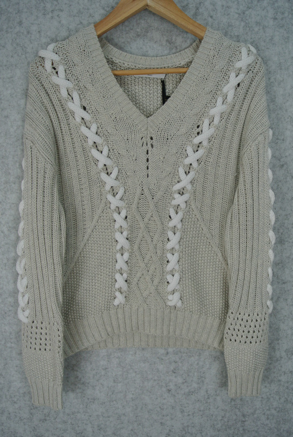 IPUL30I654 PERLE 3GG 2/16 80%COTTON 20%WOOL LADIES' KNITTED V NECK LONG SLEEVE CABLE RIB DIAMOND JACQAURD PULLOVER WITH THICK TIES EMBROIDERY