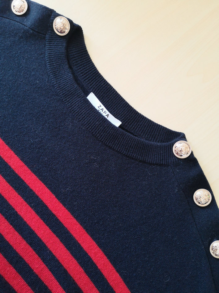 JPUL58J697 PACO 12GG 2/28 35%VISCOSE 30%WOOL 30%NYLON 5%CASHMERE LAIDES' KNITTED ROUND NECK LONG SLEEVE STRIPES PULLOVER WITH BUTTONS AT SHOULDER