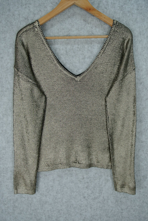 K069-FPU082 7GG 2/52 55%SILK 45%WOOL LADIES' KNITTED DOUBLE V NECK LONG SLEEVE FOIL PRINT PULLOVER